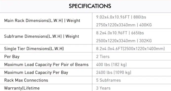 Main Rack is 4x8 feet. You can add up to 5 more 8 foot slave units for a total of 48 feet length.
